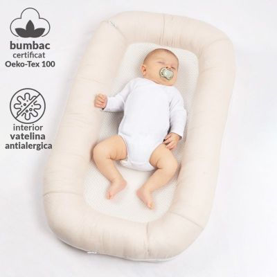 Interiorul este umplut cu vatelina moale, certificata antialergica, care ofera suport bland si sigur. Marginile protectoare creeaza o senzatie de siguranta, amintind bebelusului de mediul familiar din burtica mamei.