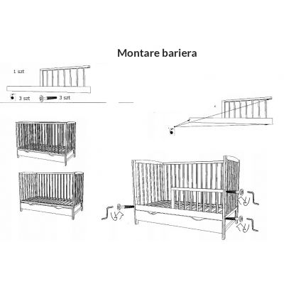 Bariera nu vine cu un set de suruburi, se monteaza cu suruburile de la laterala initiala a patutului care se demonteaza.