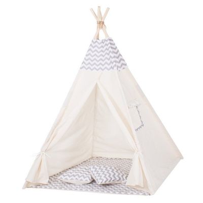 Despre Cort copii stil indian Teepee Tent ZigZag Grey XXL, include covoras gros si 2 perne