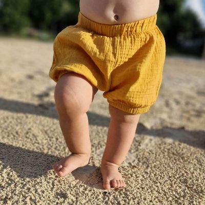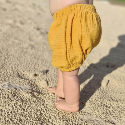 Despre Pantaloni scurti bufanti pentru bebelusi din muselina dubla Bloomers Blair Kidizi curry 0-3 luni