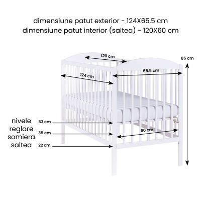- Dimensiuni interioare 120 cm x 60 cm (saltea recomandata 120x60 cm)