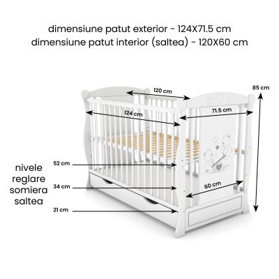 - Dimensiuni interioare 120 cm x 60 cm (saltea recomandata 120x60 cm)