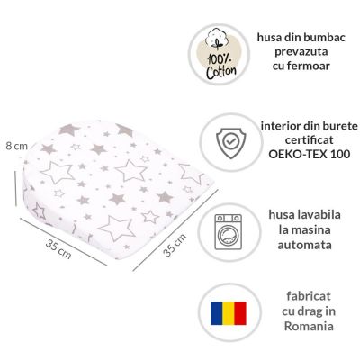 - Husa este confectionata din bumbac 100% certificat, delicat cu pielea sensibila a bebelusului. Este detasabila si lavabila la masina la 60°C, pentru o intretinere usoara.
