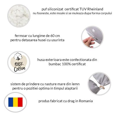 - Umplutura din interior este puf siliconizat certificat OEKO Text si poate fi usor scos sau adaugat ulterior.