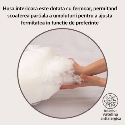 - Umplutura din interior este puf siliconizat certificat OEKO Text si poate fi usor scos sau adaugat ulterior.