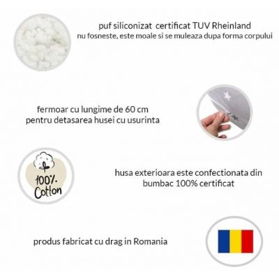 - Umplutura din interior este puf siliconizat certificat OEKO Text si poate fi usor scos sau adaugat ulterior.