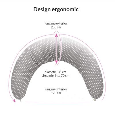 - Dimensiuni generoase – Unul dintre atuurile pernei de alaptat Hanna este dimensiunea sa generoasa de 200 x 35 cm care o face ideala pentru toate mamicile indiferent de inaltime, greutate sau perioada sarcinii.