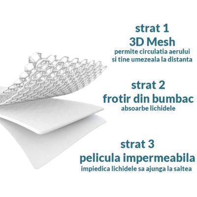 - Materialul din care este realizat stratul superior de tip 3D Mesh cu structura asemanatoare fagurelui, permite circulatia aerului si in acelasi timp are rolul de a tine umezeala la distanta in cazul in care apar mici accidente