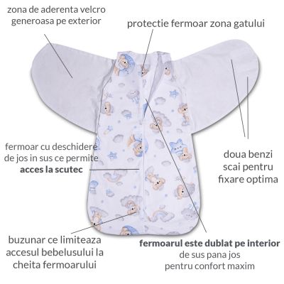 - Lungime 70 cm, ( a se consulta tabelul cu recomandari cu privire la imbracamintea copilului pe langa sac);