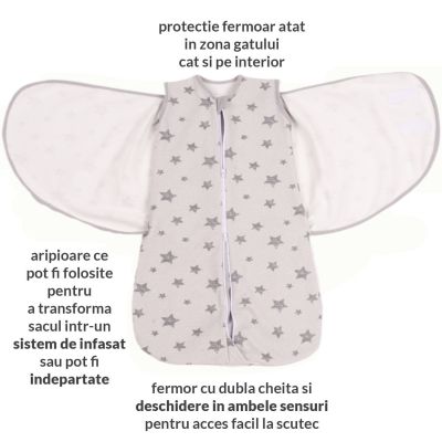 Aripioarele sunt prinse doar putin in trei puncte cheie astfel incat, atunci cand nu mai doriti sa le folositi, sau bebelusul nu le mai accepta, pot fi foarte usor inlaturate cu ajutorul unei foarfeci, ramanand astfel cu un sac de dormit classic, perfect functional pe care il veti putea folosi pana la aproximativ 9 luni.