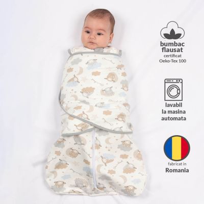 - Material certificat Oeko-Tex 100 - bumbac moale si pufos pe interior, usor elastic astfel incat sa va permita sa mulati aripioarele in jurul bebelusului creandusi acestuia senzatia de confort si siguranta pentru un somn linistit