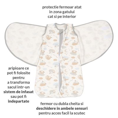 Aripioarele sunt prinse doar putin in trei puncte cheie astfel incat, atunci cand nu mai doriti sa le folositi, sau bebelusul nu le mai accepta, pot fi foarte usor inlaturate cu ajutorul unei foarfeci, ramanand astfel cu un sac de dormit classic, perfect functional pe care il veti putea folosi pana la aproximativ 9 luni.
