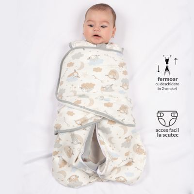 Sacul de dormit cu sistem de infasare de la Kidizi, este un sistem de infasat cu trei variante de infasare pentru bebelusi, care se ajusteaza pentru a se potrivi stilului de somn al bebelusului.