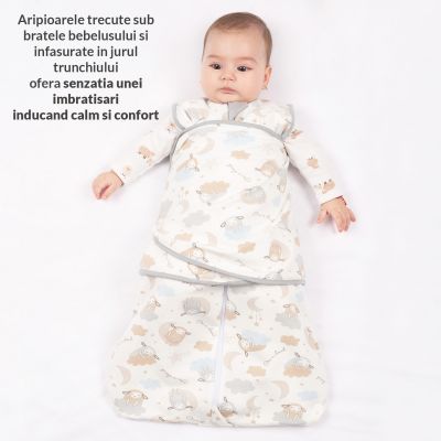 - Material certificat Oeko-Tex 100 - bumbac moale si pufos pe interior, usor elastic astfel incat sa va permita sa mulati aripioarele in jurul bebelusului creandusi acestuia senzatia de confort si siguranta pentru un somn linistit
