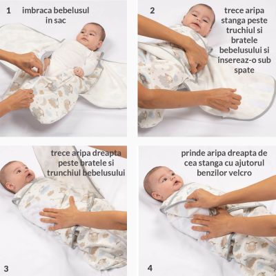 - asezati mainile bebelusului langa trunchi si infasurati-le in aripioare;