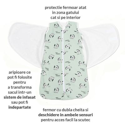 - Sac de dormit generos - daca detasati aripioarele, veti avea un sac de dormit clasic cu o grosime de 1 tog pe care il veti putea folosi pana la minim 6 luni;