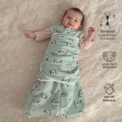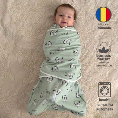 Despre Sac de dormit bebelusi cu sistem de infasare din bumbac flausat Kidizi Zebra Mint, 0-6 luni, 1 tog