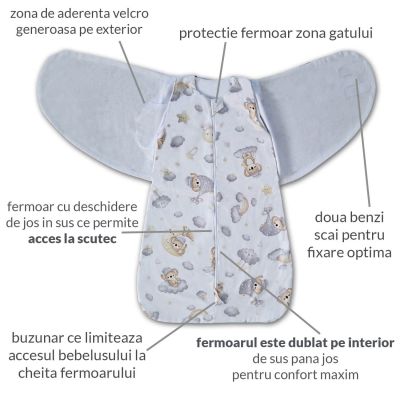 - Timp de somn mai lung – Bebelusul va dormi mai sanatos si mai mult, experimentand sentimentul de siguranta al sacului de dormit cu sistem de infasare.