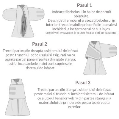 Puteti sa infasati bebelusul cu bratele in sus, cu mainile fata in fata sau cu unul sau ambele brate in afara pentru a asigura somnul optim al bebelusului.