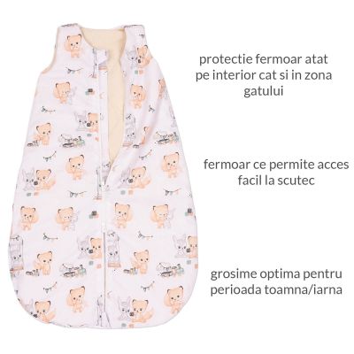 - Grosime 1 tog - recomandat pentru temperaturi de 18-23 grade, ( a se consulta tabelul cu recomandari cu privire la imbracamintea copilului pe langa sac);