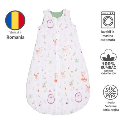 Confectionat din doua straturi de bumbac 100% fata/verso, cu un croi larg ce permite miscari ample bebelusului, acest model de saculet se recomanda pentru a fi folosit de la temperaturi de 24 de grade in sus.