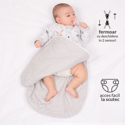 Prevazut cu un fermoar lateral cu dublu sens, sacul permite o deschidere usoara, ideala pentru schimbarea rapida a scutecului. Aceasta functionalitate reduce expunerea bebelusului la frig, oferindu-i confort pe timpul noptii.