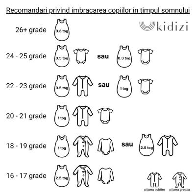 - Grosime: 1 Tog, recomandat pentru temperaturi de 20-23°C (consultati tabelul cu recomandari pentru imbracamintea copilului).