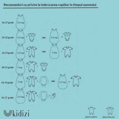 - Grosime: 1 Tog, recomandat pentru temperaturi de 20-23°C (consultati tabelul cu recomandari pentru imbracamintea copilului).