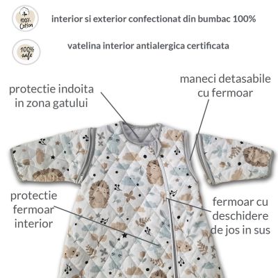 Un model de saculet versatil, confectionat din material matlasat (bumbac interior si exterior), prevazut cu maneci detasabile, perfect pentru a oferi confort si caldura copilasului in zilele mai racorase ale anului.