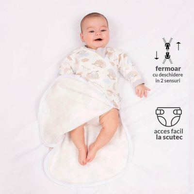 SAcul este prevazut pe lateral cu un fermoar generos ce pe langa faptul ca nu deranjeaza bebelusul in partea frontala, dar permite deschiderea „tip carte” aspect extrem de util la imbracare/dezbracare. Totodata, fiind prevazut cu 2 cheite si dublu sens, fermoarul permite schimbarea rapida a scutecului, fara a dezbraca complet bebelusul. Acest lucru minimizeaza riscul ca bebelusul sa simta frigul in timpul schimbarii scutecului pe timpul noptii. -