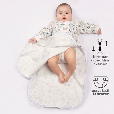 SAcul este prevazut pe lateral cu un fermoar generos ce pe langa faptul ca nu deranjeaza bebelusul in partea frontala, dar permite deschiderea „tip carte” aspect extrem de util la imbracare/dezbracare. Totodata, fiind prevazut cu 2 cheite si dublu sens, fermoarul permite schimbarea rapida a scutecului, fara a dezbraca complet bebelusul. Acest lucru minimizeaza riscul ca bebelusul sa simta frigul in timpul schimbarii scutecului pe timpul noptii. -