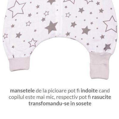 Cu un design bine gandit ce ofera mobilitate copilasului, saculetul de dormit cu picioare poate fi utilizat in majoritatea cazurilor o perioada mai lunga decat cea recomandata de producator. Secretul din spatele acestui aspect il reprezinta piciorusele croite astfel incata ele sa poate fi indoite pentru atuncai cand copilasul este mai mic, sau desfacute pentru atunci cand creste.