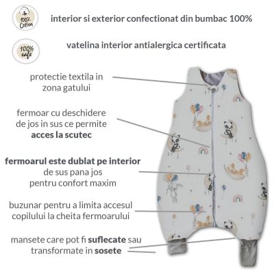 - Grosime 1 tog - recomandat pentru temperaturi de 18-23 grade ( a se consulta tabelul cu recomandari cu privire la imbracamintea copilului pe langa sac);