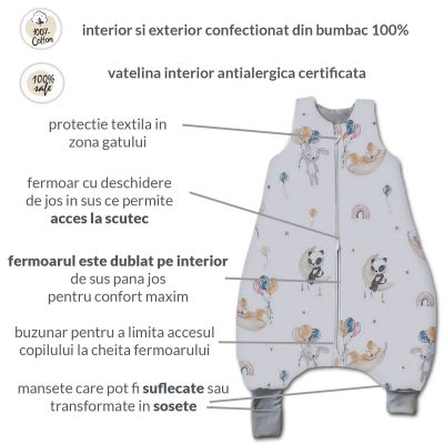 - Grosime 1 tog - recomandat pentru temperaturi de 18-23 grade( a se consulta tabelul cu recomandari cu privire la imbracamintea copilului pe langa sac);