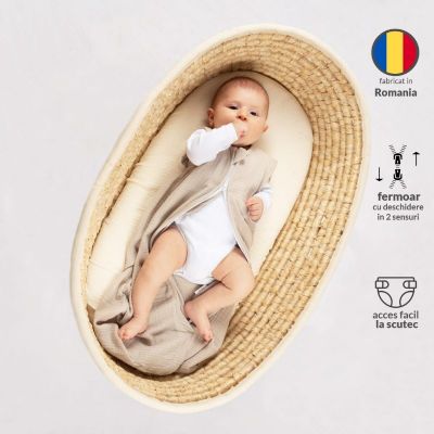 Intrucat in primele luni de viata bebelusii nu au inca dezvoltata optim capacitatea de autoreglare a temperaturii corporale si caldura excesiva poate fi mai daunatoare decat frigul, este foarte important ca ei sa fie imbracati corespunzator. Din acest motiv am creat saculetul de vara din muselina dubla cu o grosime de doar 0.3 tog si care poate fi folosit de la aproximativ 3.5 kg si pana la 8-10 kg.