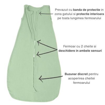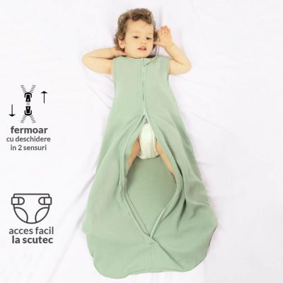 Un saculet de dormit ideal pentru zilele calduroase ale anului, cand vrei sa stii ca bebelusul sta acoperit dar in acelasi timp nu se supraincalzeste.