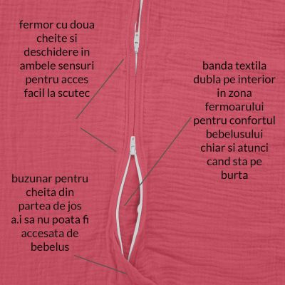 - Pe partea din interior, intreg fermoarul este pretejat de o banda textila dubla astfel incat bebeblusul sa nu simta fermoarul chiar si atunci cand sta pe burtica
