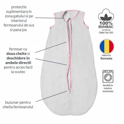 Un saculet de dormit ideal pentru zilele calduroase ale anunlui, cand vrei sa stii ca bebelusul sta acoperit dar in acelasi timp nu se supraincalzeste.