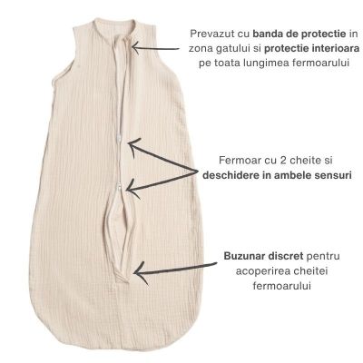 Un saculet de dormit ideal pentru zilele calduroase ale anului, cand vrei sa stii ca bebelusul sta acoperit dar in acelasi timp nu se supraincalzeste.