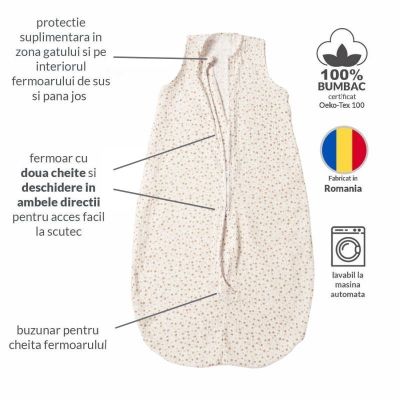 Un saculet de dormit ideal pentru zilele calduroase ale anunlui, cand vrei sa stii ca bebelusul sta acoperit dar in acelasi timp nu se supraincalzeste.
