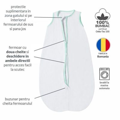Un saculet de dormit ideal pentru zilele calduroase ale anunlui, cand vrei sa stii ca bebelusul sta acoperit dar in acelasi timp nu se supraincalzeste.