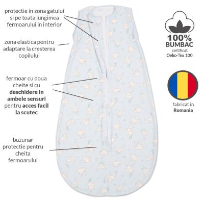 - Saculetul este confectionat din bumbac 100% certificat placut la atingere si delicat cu pielea bebelusului.