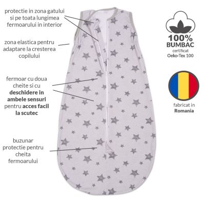 - Saculetul este confectionat din bumbac 100% certificat placut la atingere si delicat cu pielea bebelusului.