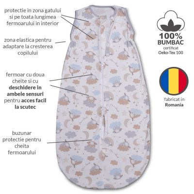 - Saculetul este confectionat din bumbac 100% certificat placut la atingere si delicat cu pielea bebelusului.
