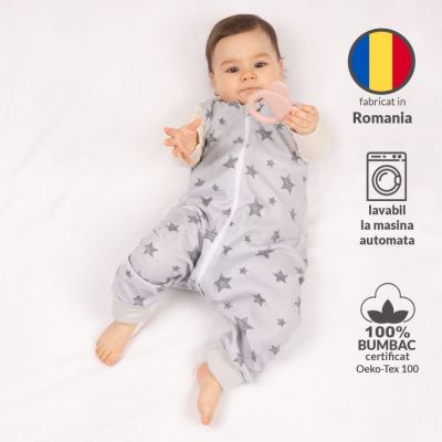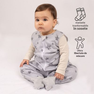 Poate fi folosit direct ca si prim strat sau poate sa fie imbracat peste un body sau pantalon subtire ( va sfatuim sa consultati tabelul cu recomandari cu privire la imbracamintea copilului pe langa sac in functie de temperatura ambientala)