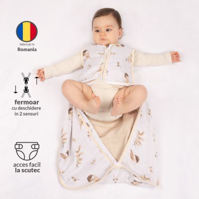 Saculetul este confectionat atat la interior cat si la exterior din muselina din bumbac 100% certificat placut la atingere si delicat cu pielea bebelusului