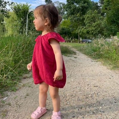 Despre Salopeta bebelusi din muselina cu maneca scurta si volanase Kidizi Freya chilli 6-12 luni