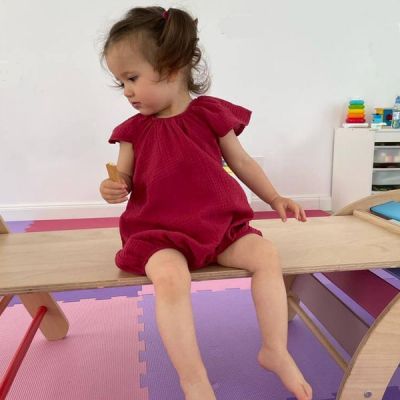 Despre Salopeta bebelusi din muselina cu maneca scurta si volanase Kidizi Freya salmon 12-18 luni