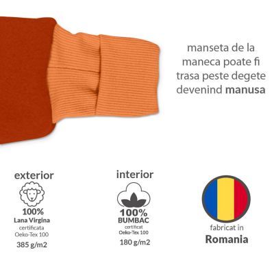 Pentru marimile 1-2 ani si 3-4 ani, mansetele de la maini se pot transforma in manusi, astfel ca manuta copilasului este acoperita pe jumatate tot timpul si exista posibilitatea de a se transforma in manusa pentru a acoperi intreaga mana.