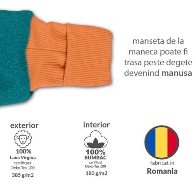 Pentru marimile 1-2 ani si 3-4 ani, mansetele de la maini se pot transforma in manusi, astfel ca manuta copilasului este acoperita pe jumatate tot timpul si exista posibilitatea de a se transforma in manusa pentru a acoperi intreaga mana.